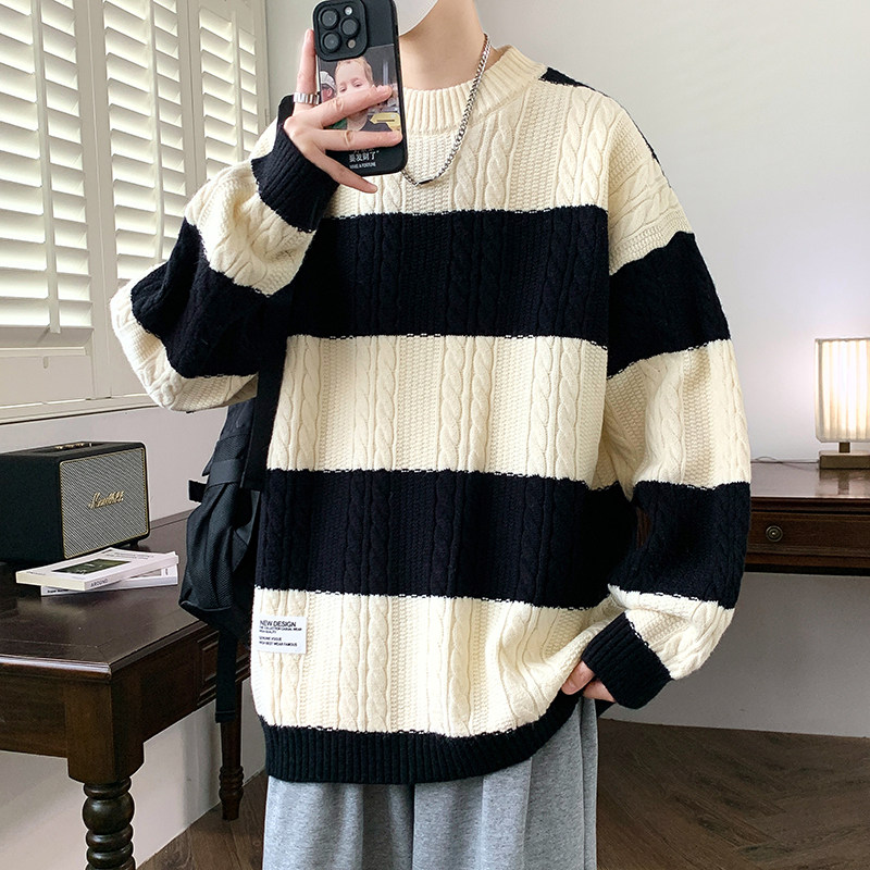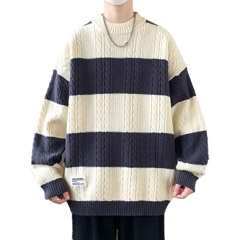 撞色条纹毛衣男款2025秋季宽松圆领打底针织衫青少年加厚保暖以純