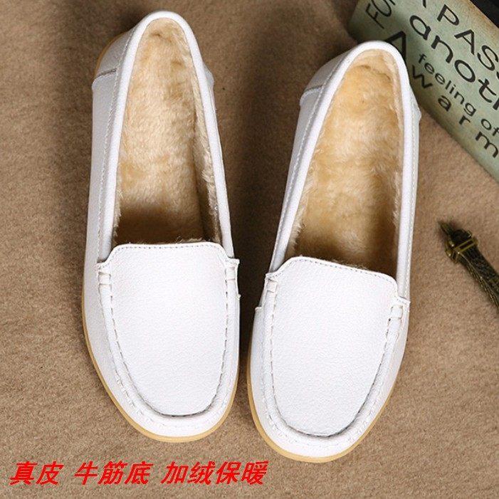 秋冬真皮护士女鞋加绒保暖豆豆鞋牛筋底防滑中老年妈妈鞋平底棉鞋