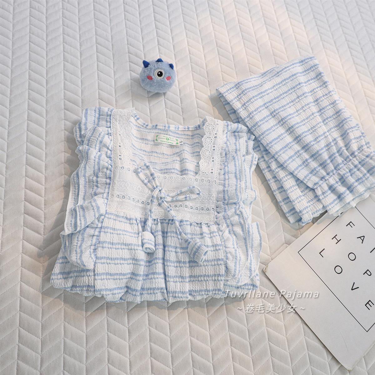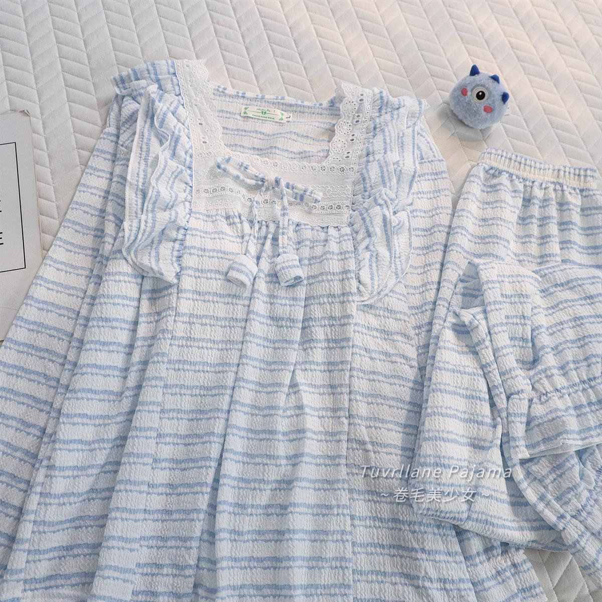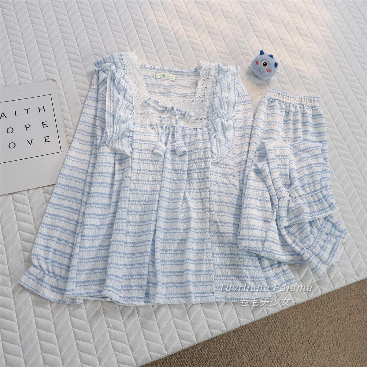ins宫廷风蓝色条纹长袖睡衣女士春秋季新款带胸垫甜美套装家居服