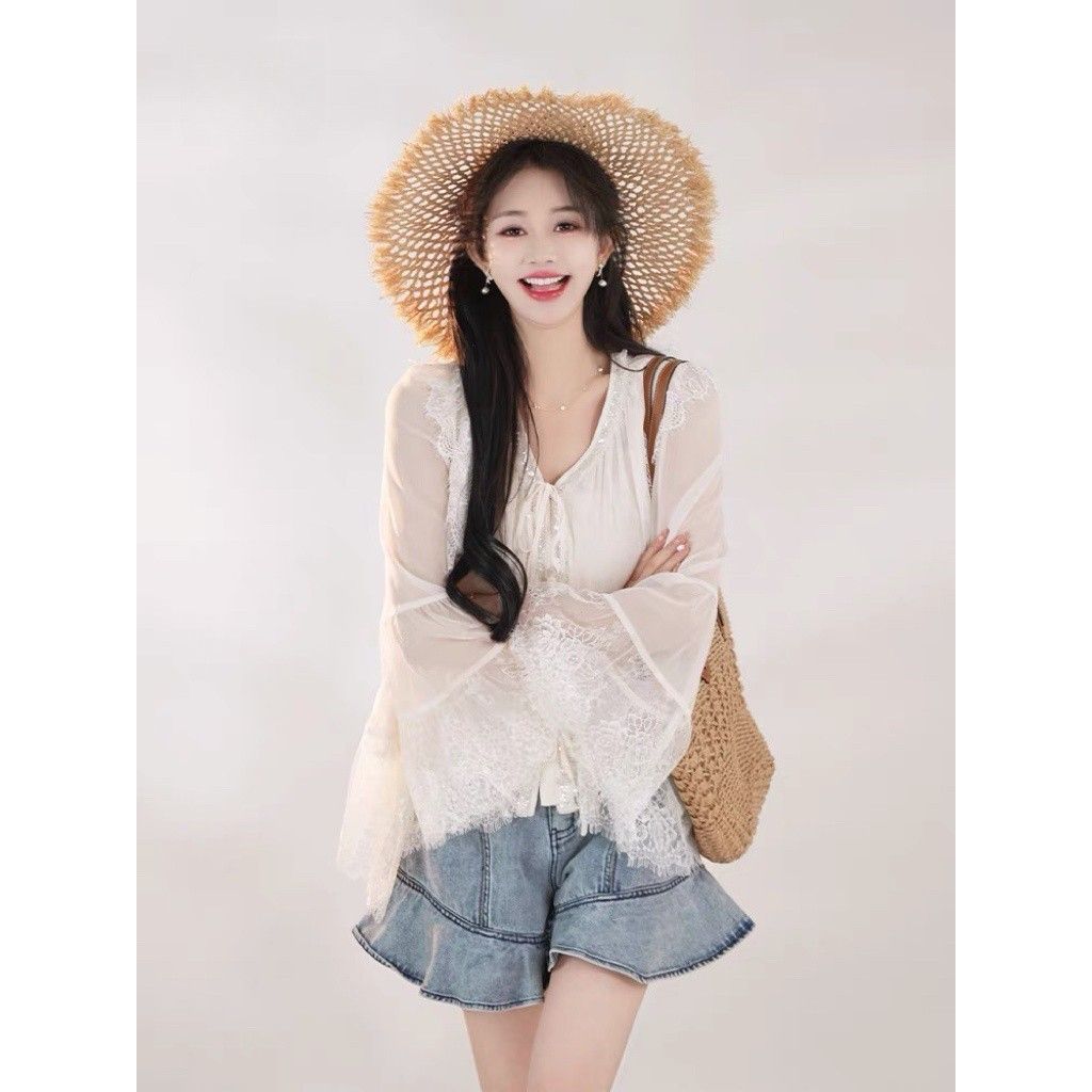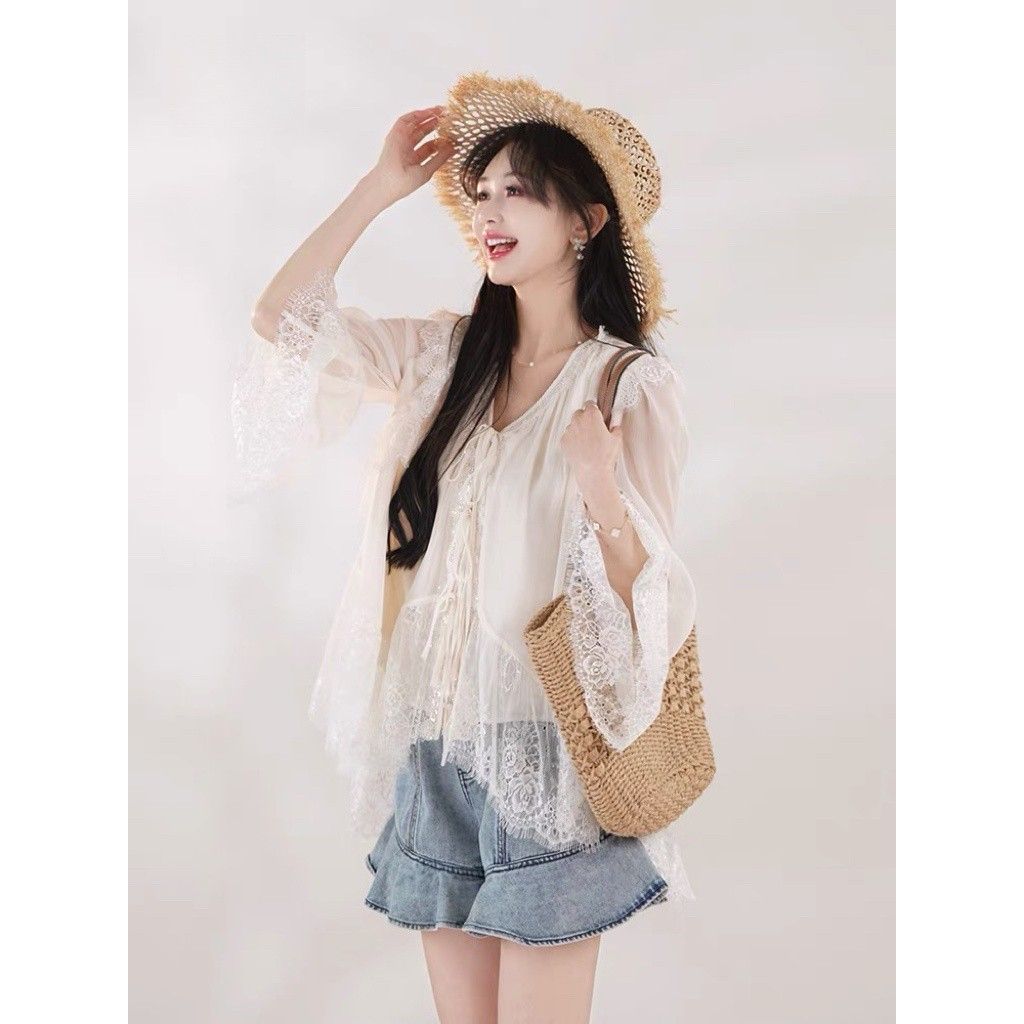 ins风法式蕾丝拼接上衣短裤两件