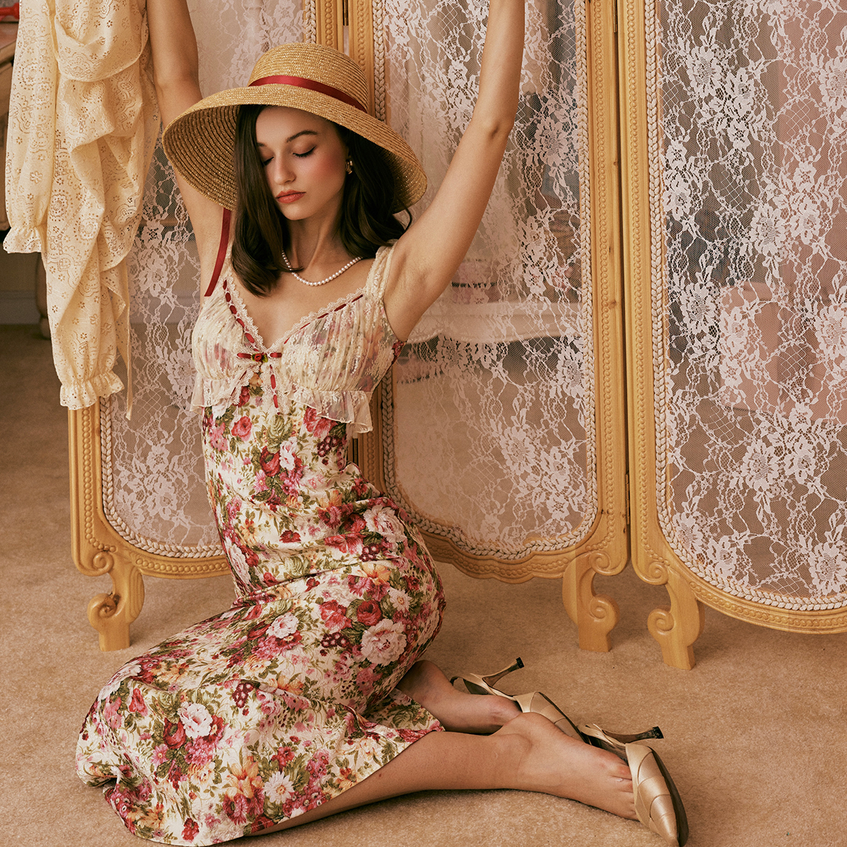 LaceMade 人间富贵花 法式复古浪漫满印牡丹花肌理感连衣裙印花裙
