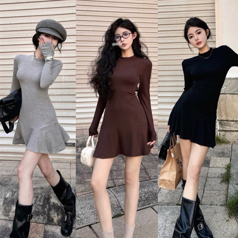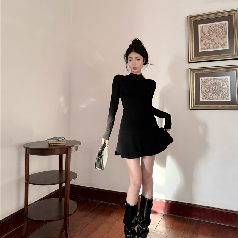 黑色气质半高领连衣裙女春秋冬新款收腰紧身长袖内搭打底a字短裙