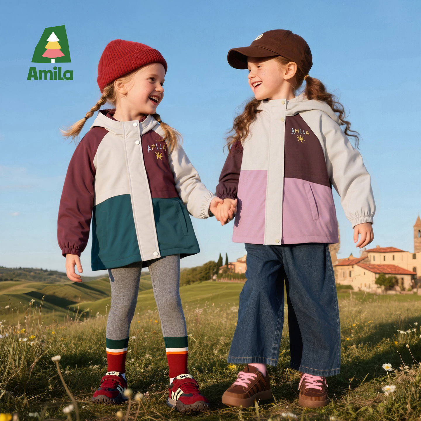Amila女童撞色冲锋衣2025新款秋季儿童秋装外套宝宝户外连帽风衣