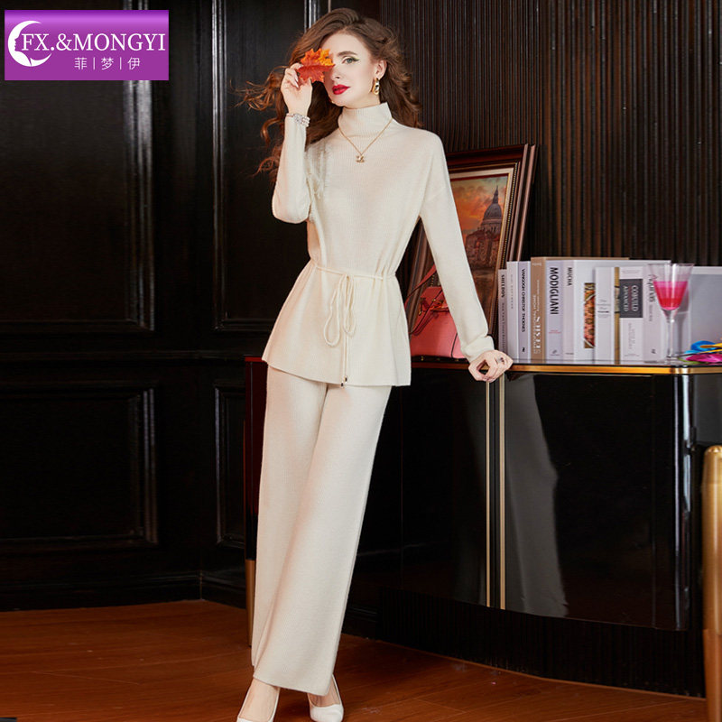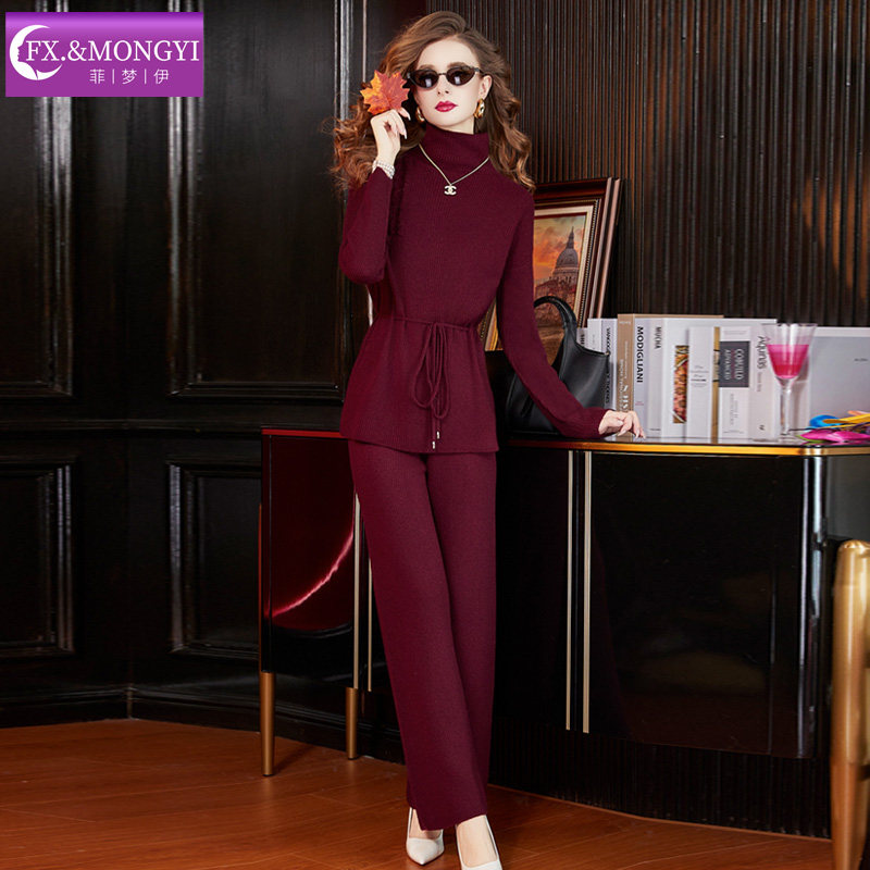 菲梦伊100绵羊毛红色针织套装女冬季高领套头系带打底毛衣阔腿裤