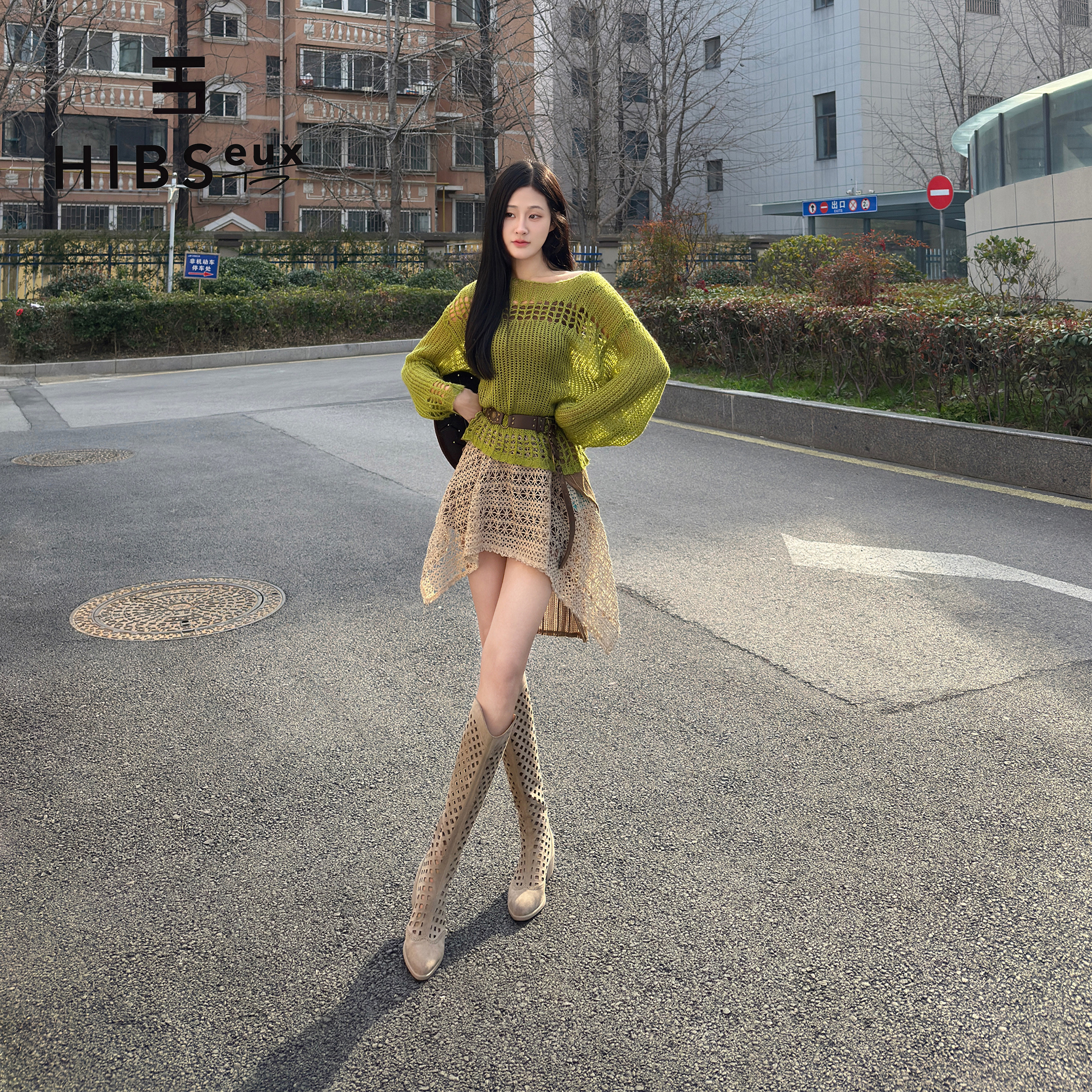 镂空长靴女尖头绒面粗跟透气通勤高筒靴百搭靴子显瘦瘦瘦靴长筒靴
