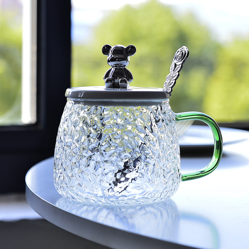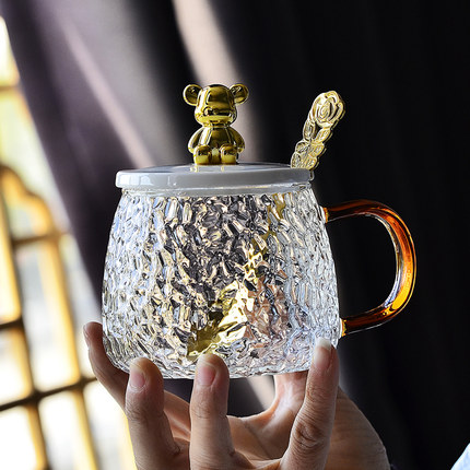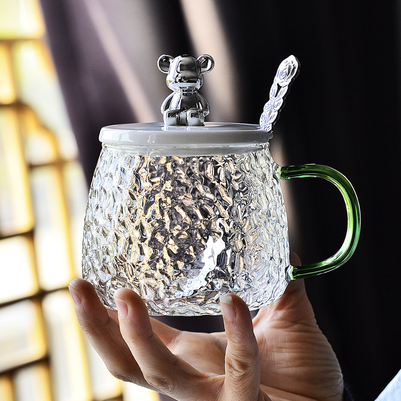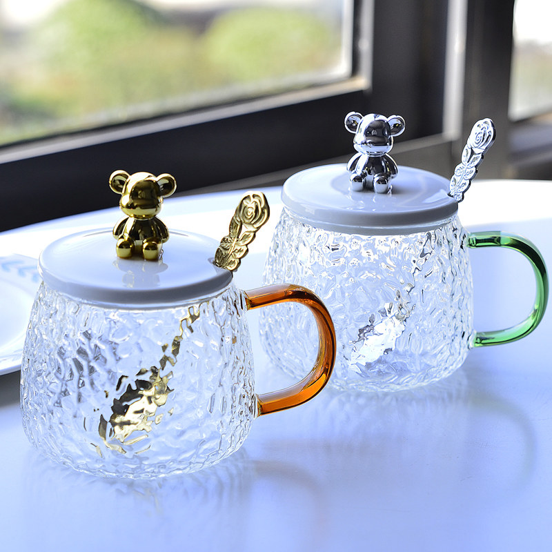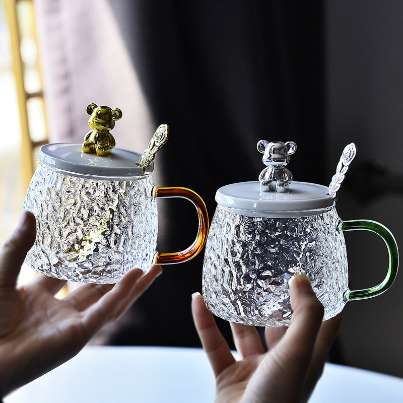 ins小熊耐高温锤纹玻璃水杯子女生马克带盖勺咖啡杯早餐茶杯韩式