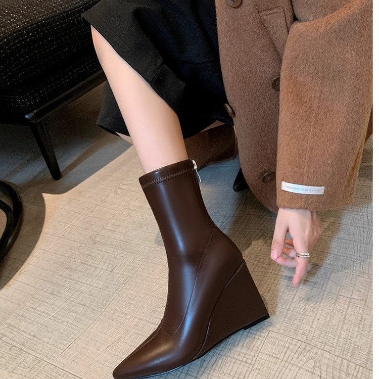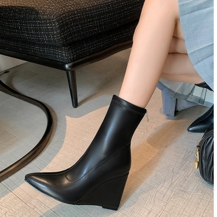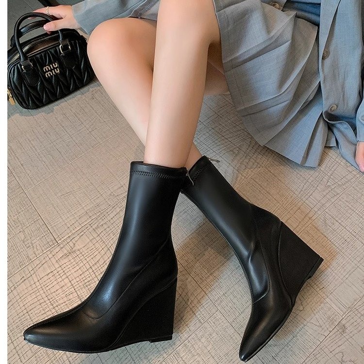 尖头坡跟短靴女2025秋冬季新款时尚小个子增高显瘦高跟弹力瘦瘦靴