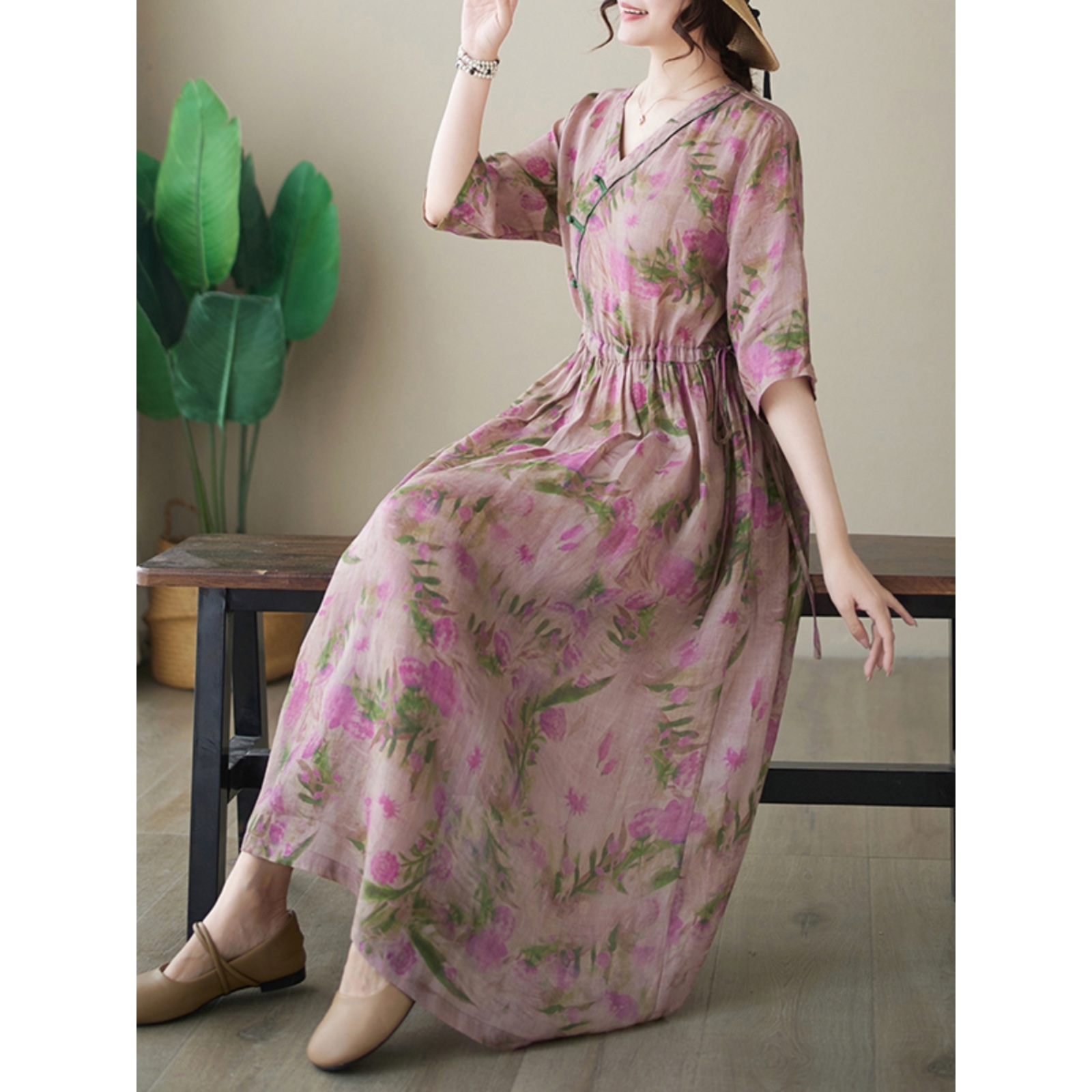 广州十三行棉麻碎花连衣裙女士夏季大码妈妈遮肚子高端亚麻苎麻气
