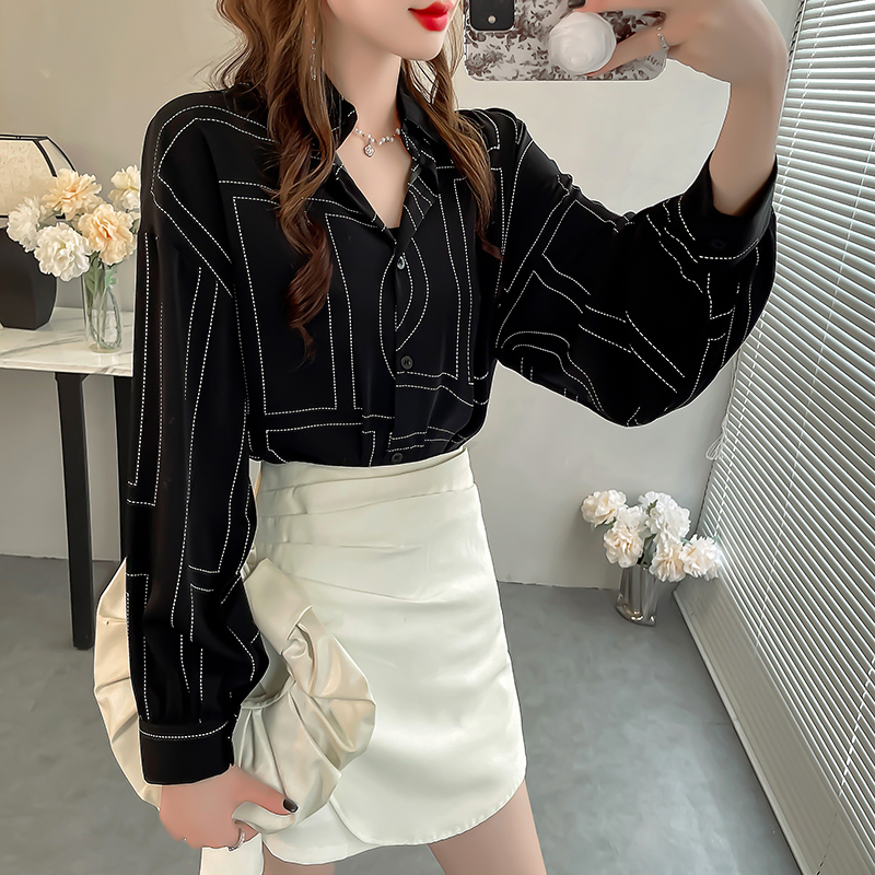 秋装简约通勤衬衫女设计感小众衬衣显瘦黑色别致印花长袖雪纺上衣
