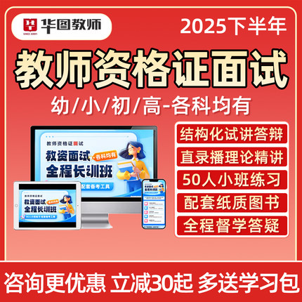 华图教师资格证面试网课2025下半年幼儿园小学初中高中教资试讲稿逐字稿结构化答辩视频资料语文数学英语音乐体育考前冲刺急救课程