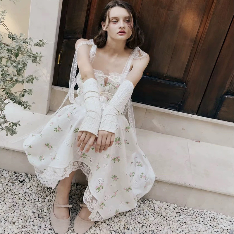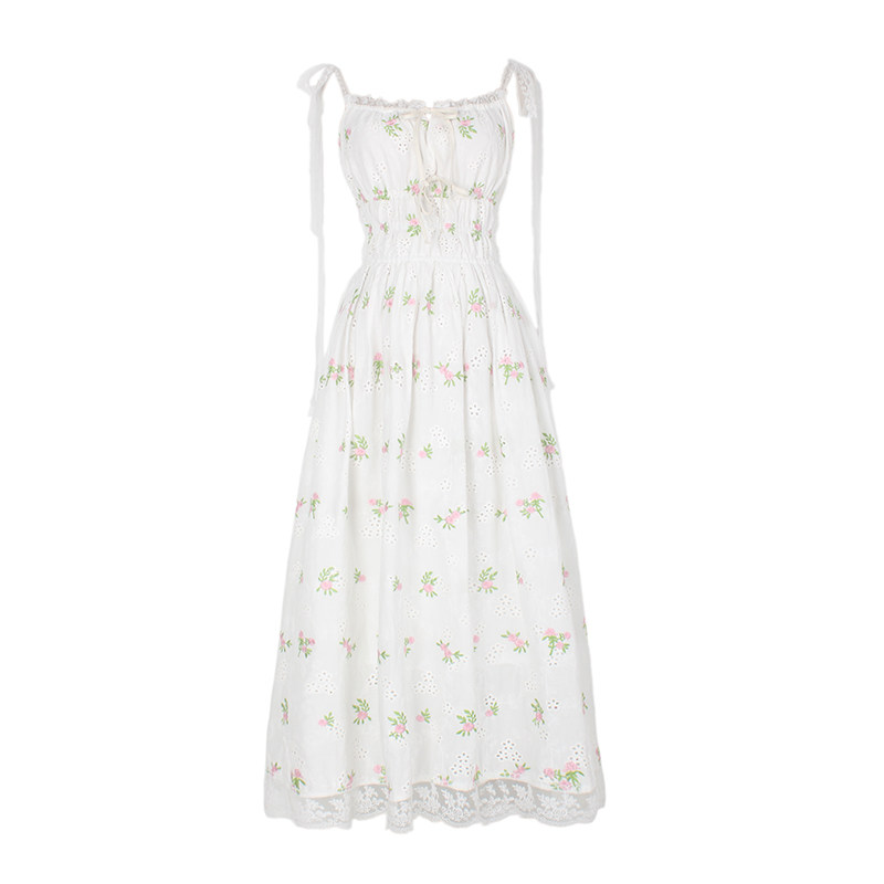 泰风设计感小众法式浪漫花朵刺绣碎花高腰蕾丝吊带绑带连衣裙度假