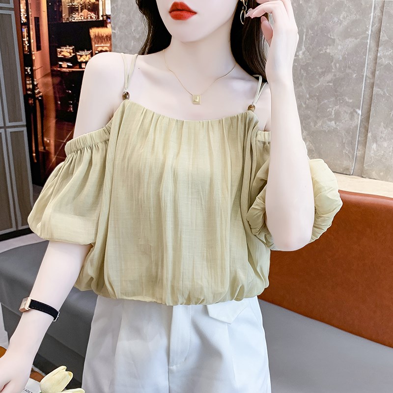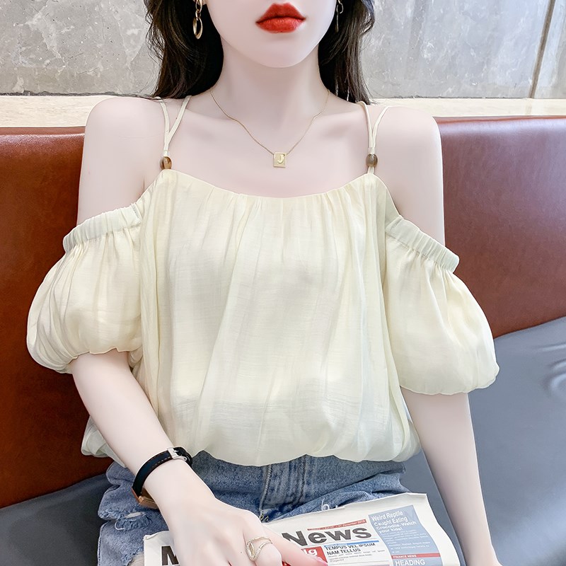 性感露肩一字领吊带雪纺衫女夏装新款宽松显瘦泡泡短袖衬衫上衣服