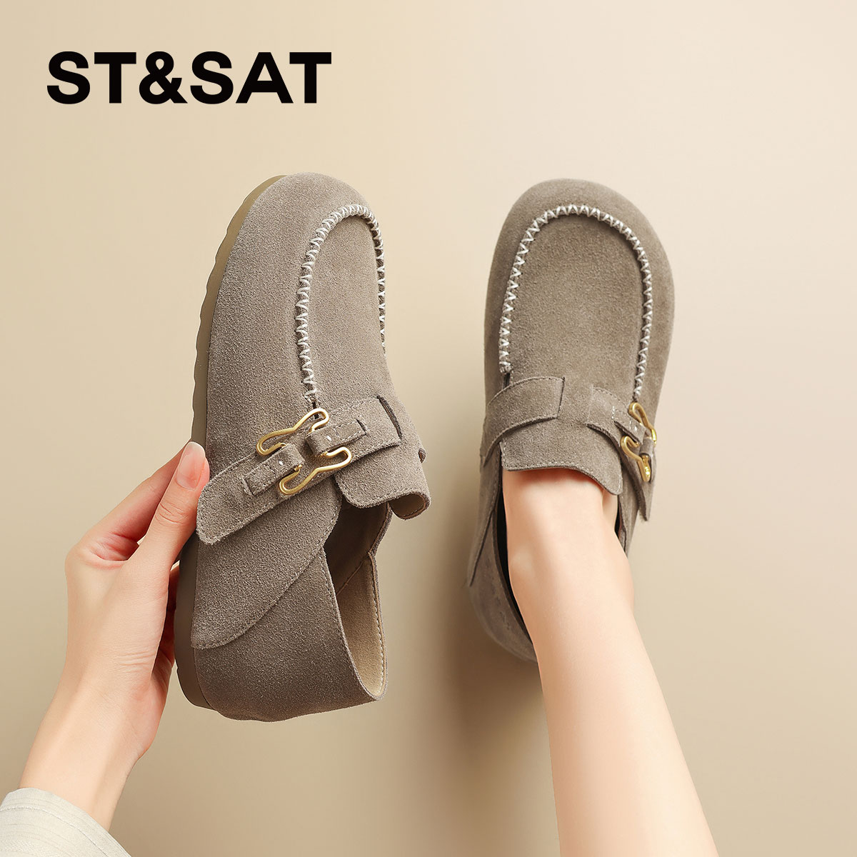 星期六复古真皮软木勃肯鞋女鞋2025秋冬新款厚底单鞋一脚蹬豆豆鞋