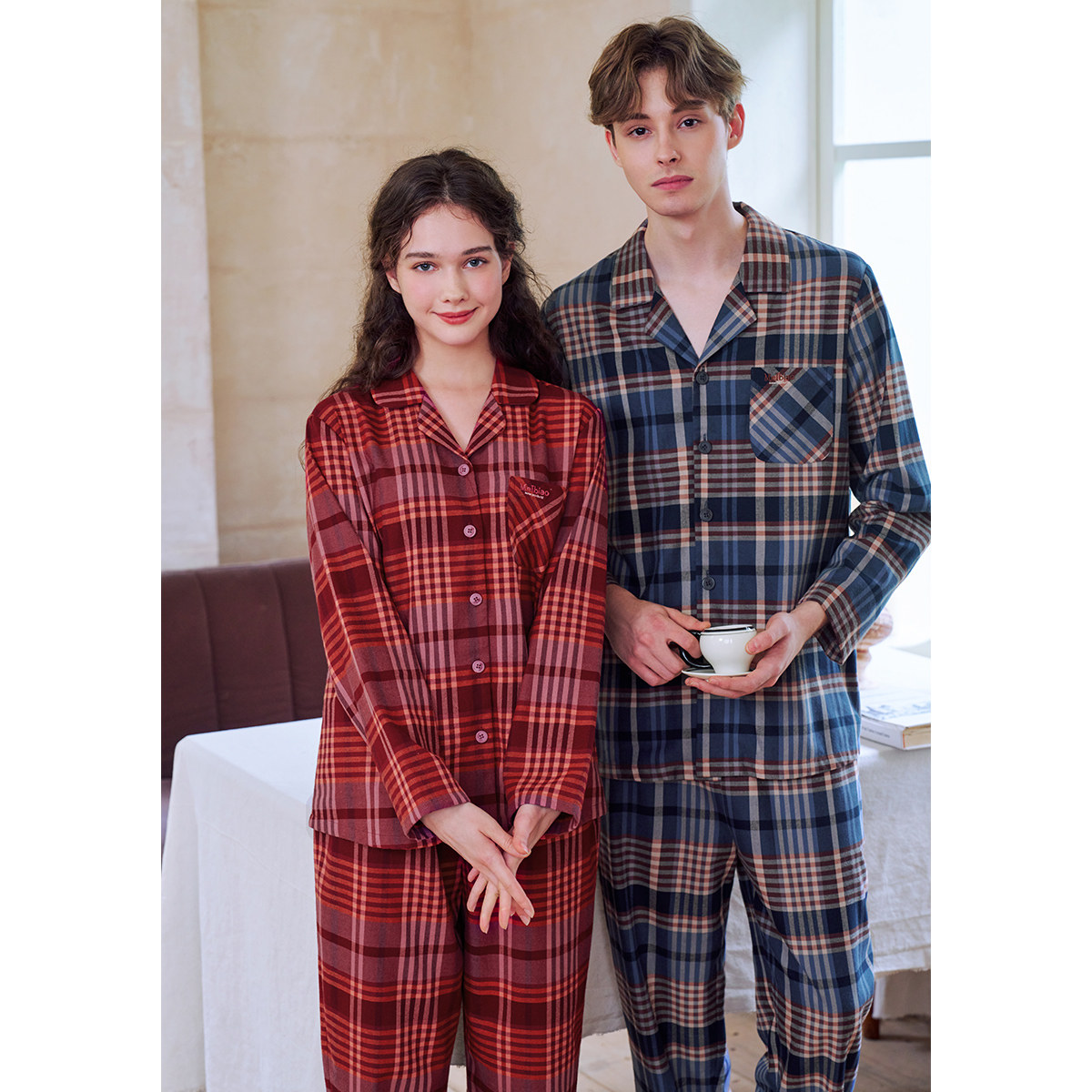 美标情侣纯棉磨毛睡衣套装