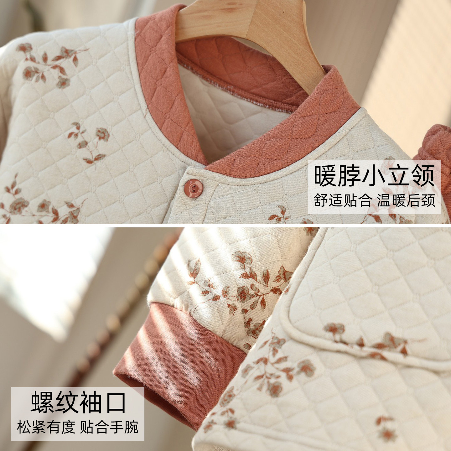 纯棉开衫保暖套装女士中老年妈妈国风对襟内衣套装三层夹棉家居服