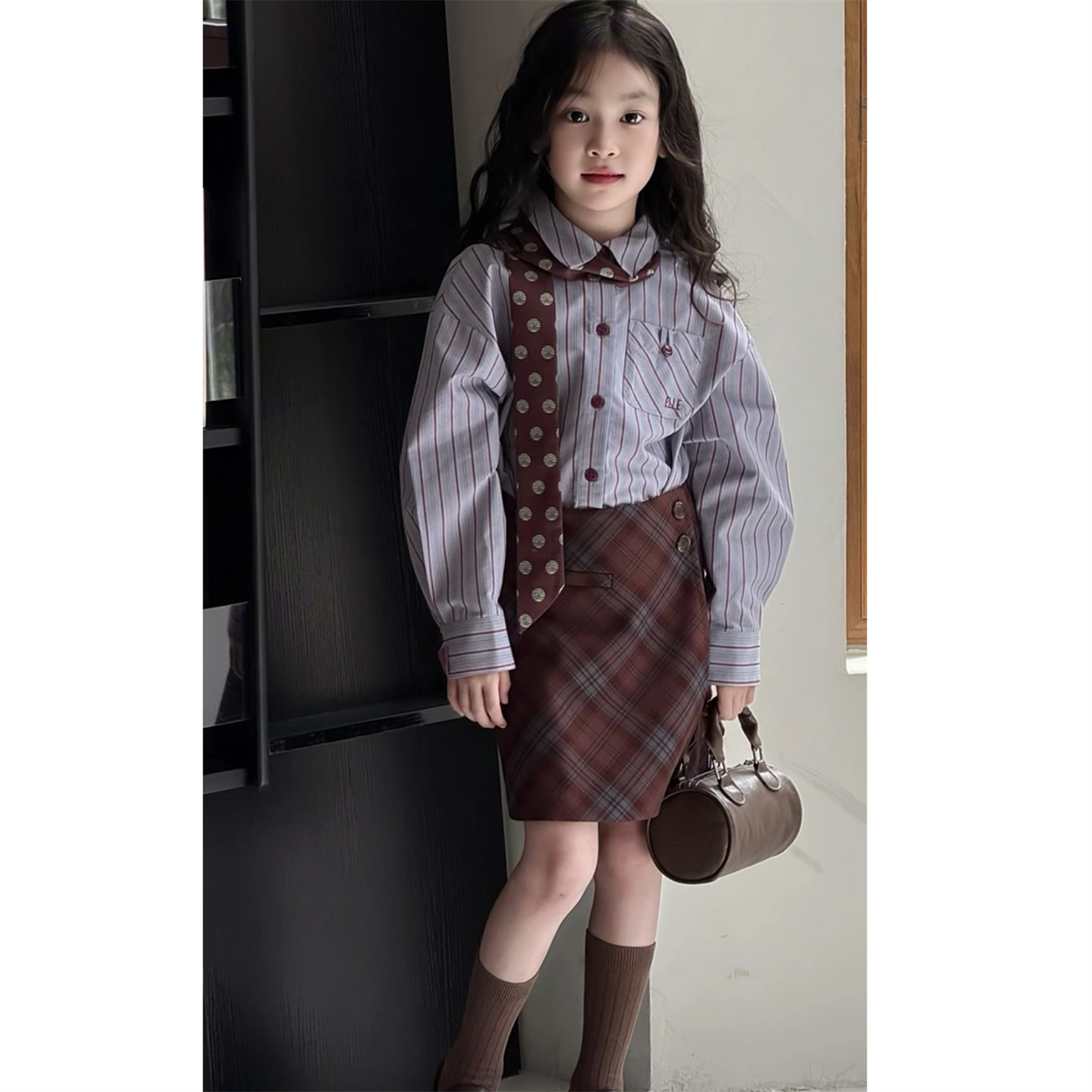 韩版童装秋冬季新款女童老钱风翻领外套条纹衬衫撞色格子A字半裙