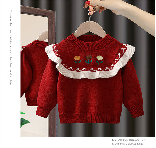 女童毛衣秋冬2025新款小童洋气套头圆领荷叶边女宝宝冬季针织上衣
