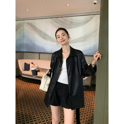 pusumede【现货6折】 黑色中长款皮衣女春秋系带收腰pu皮外套