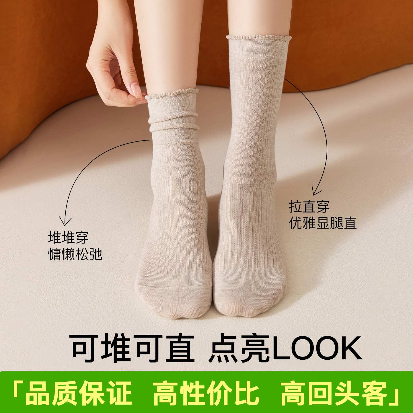 白色袜子女款纯棉中筒袜无骨堆堆袜抑菌春秋花边防臭吸汗月子长袜