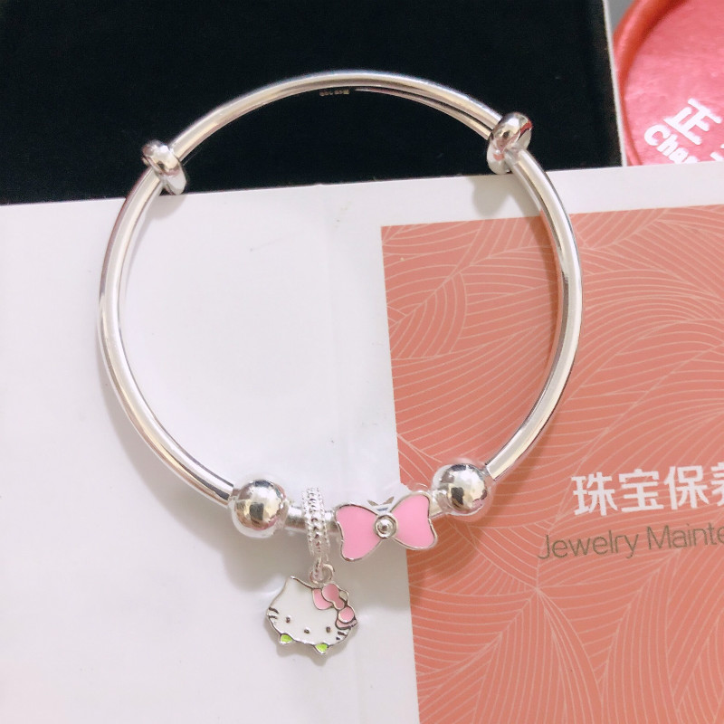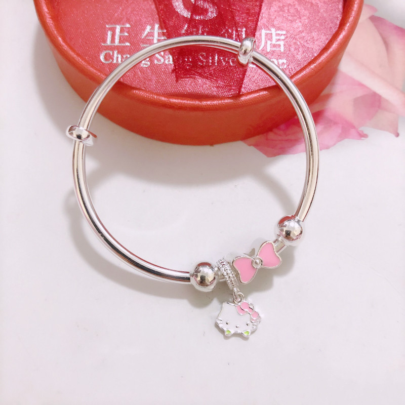 正品香港正生纯银蝴蝶结kt猫中童学生手镯足银999女可爱首饰爆款