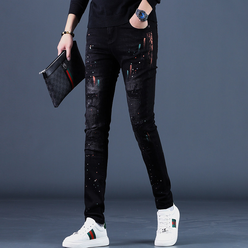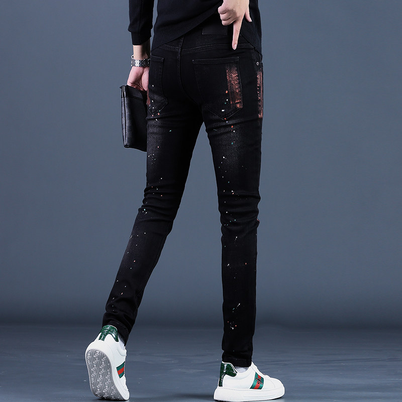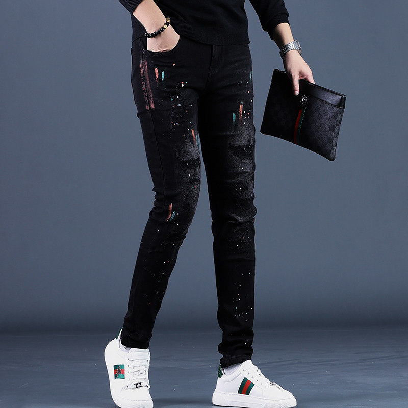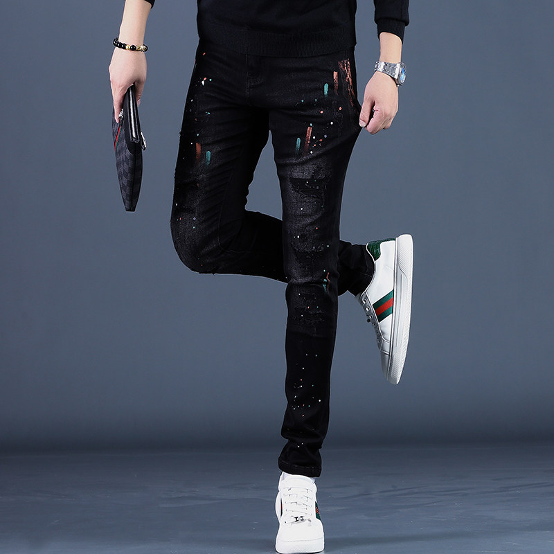 2025秋季黑色破洞男士牛仔裤男潮牌修身百搭小脚休闲裤子韩版潮流