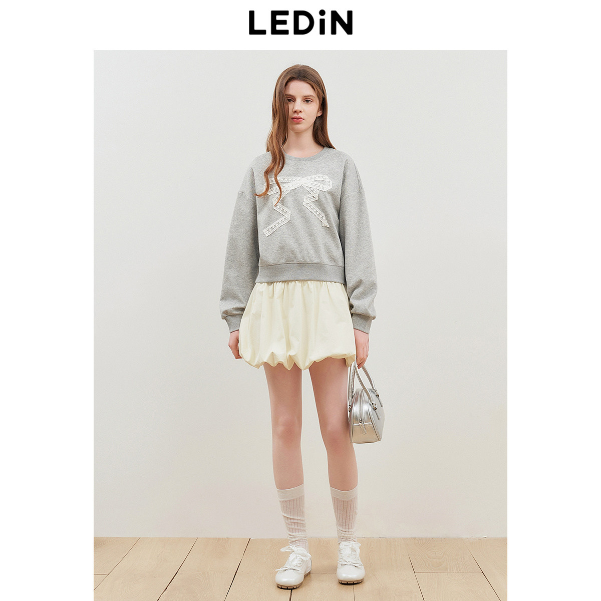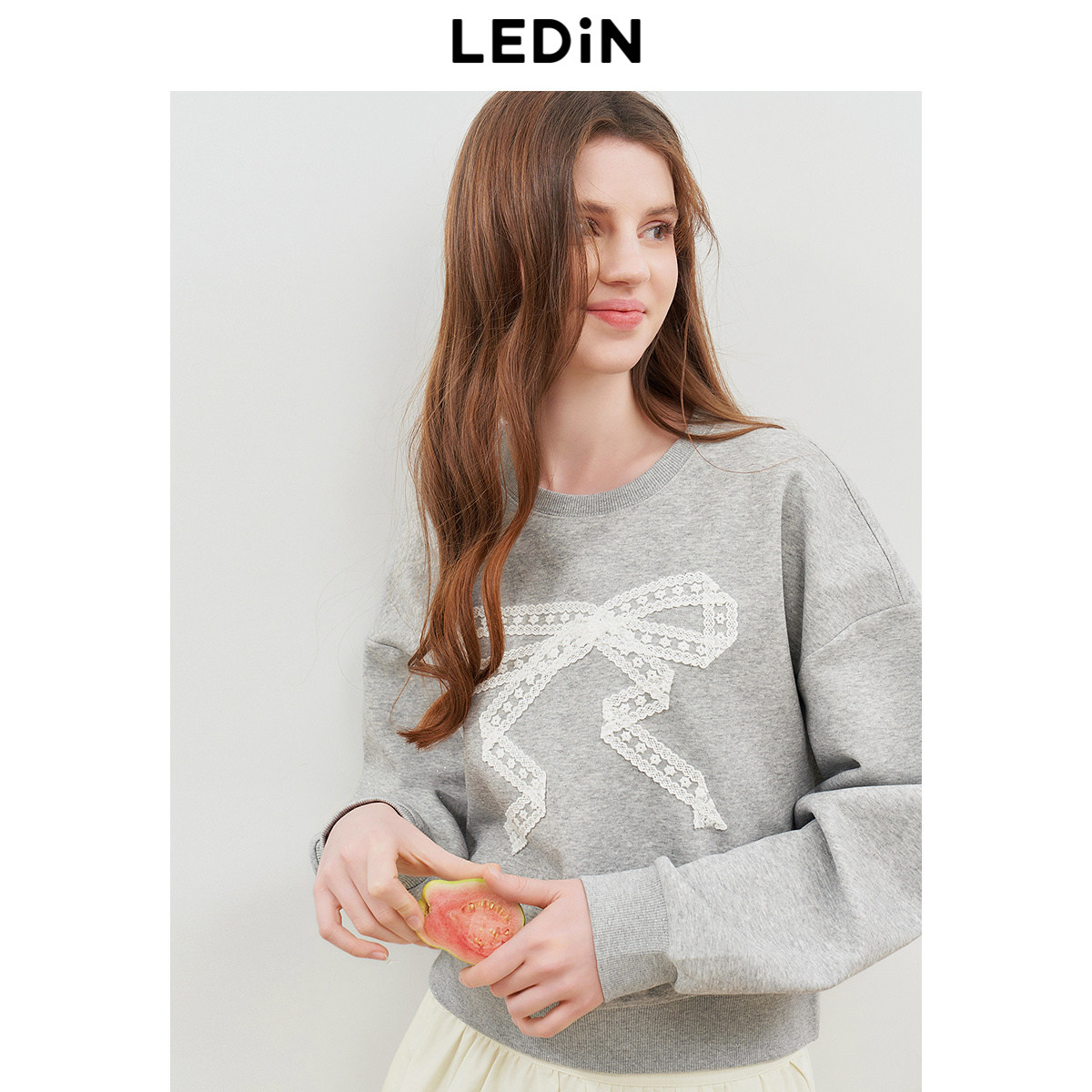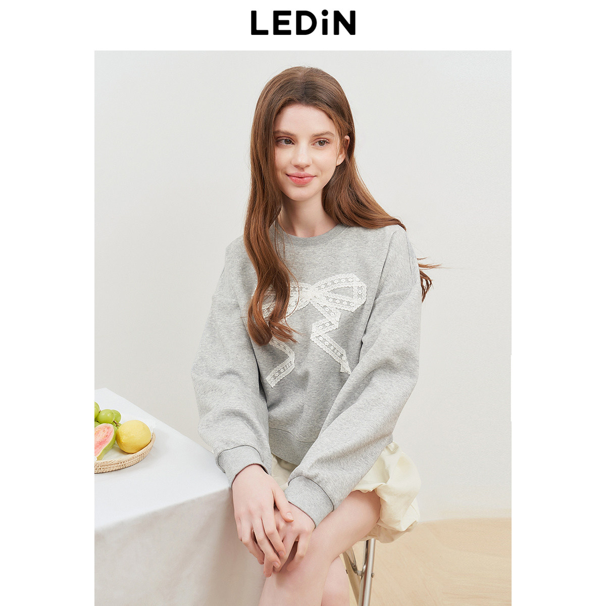 乐町简约宽松短款卫衣女装2025秋新款蕾丝蝴蝶结圆领上衣灰色卫衣