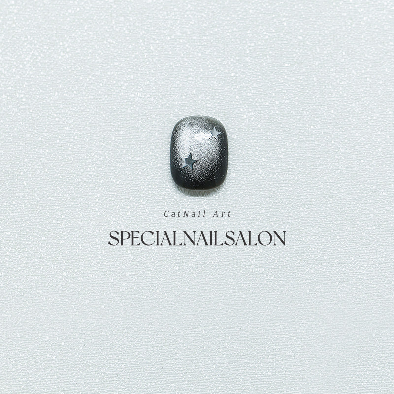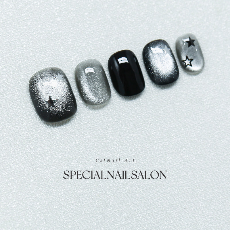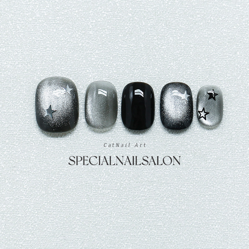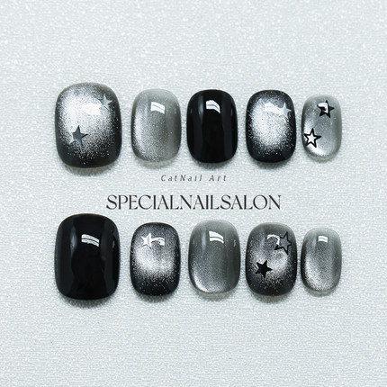 【星语夜曲】纯手工穿戴甲暗黑风黑曜石爆闪星星猫眼显白美甲贴片