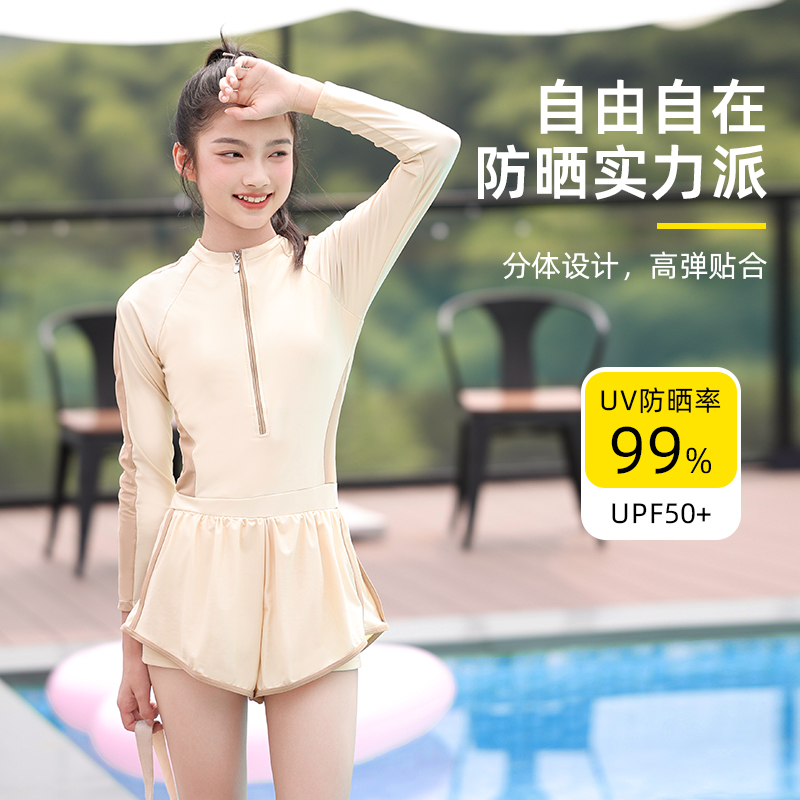 儿童泳衣中大童2025新款少女初中生游泳衣长袖防晒连体平角游泳装