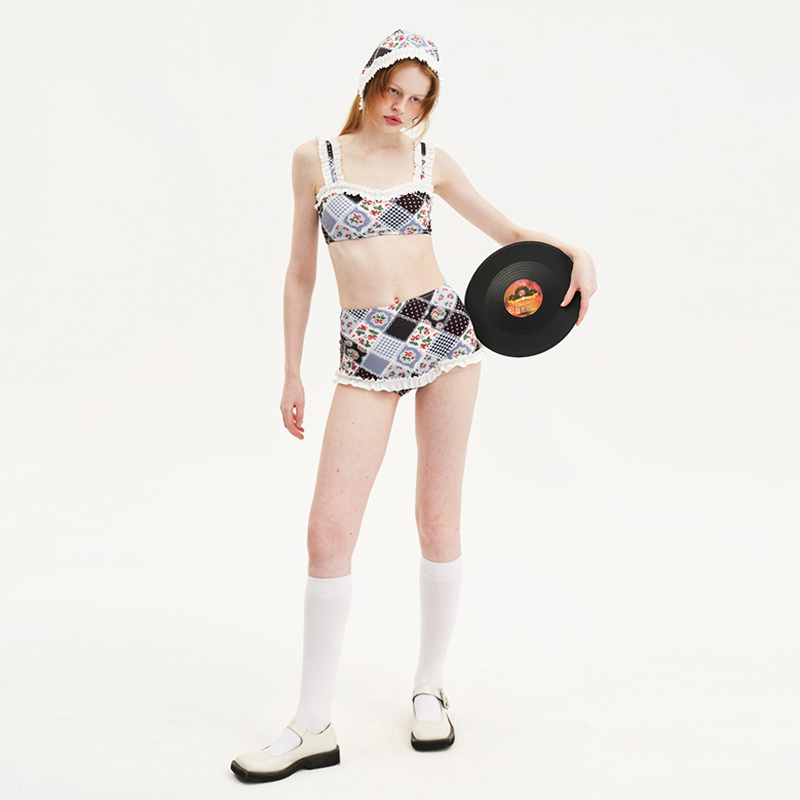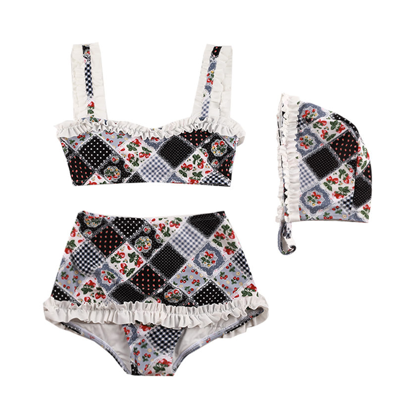 MOF弹力商店 格子平胸少女荷叶边吊带分体小裙子泳衣送泳帽