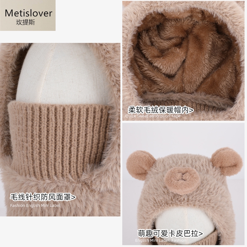 卡通小熊面罩围脖一体儿童帽子男女孩冬季户外毛绒保暖针织毛线帽