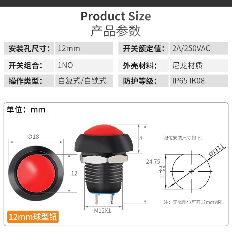 12mm小型防水自锁自复位点动自锁按钮开关圆形按键常开球形启动