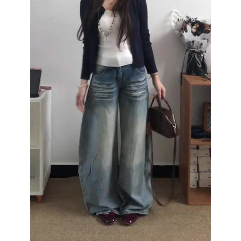 高个子胖MM折痕宽松浅色慵懒感牛仔裤女秋冬新款高腰显瘦阔腿裤子