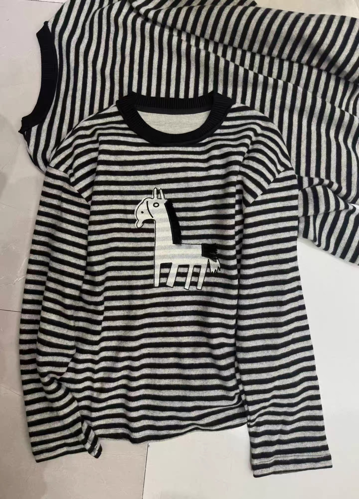 韩伊hanyi正品冬款卡通马儿重工艺羊绒条纹长袖T恤打底衫女上衣