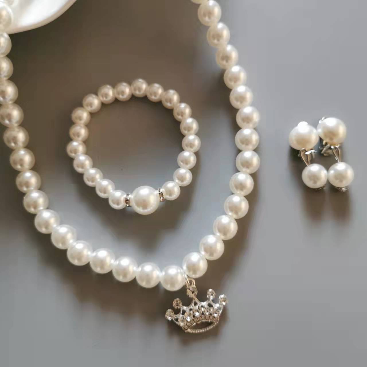 新款儿童小公主仿珍珠项链手链耳夹三件套 女童宝宝首饰套装饰品