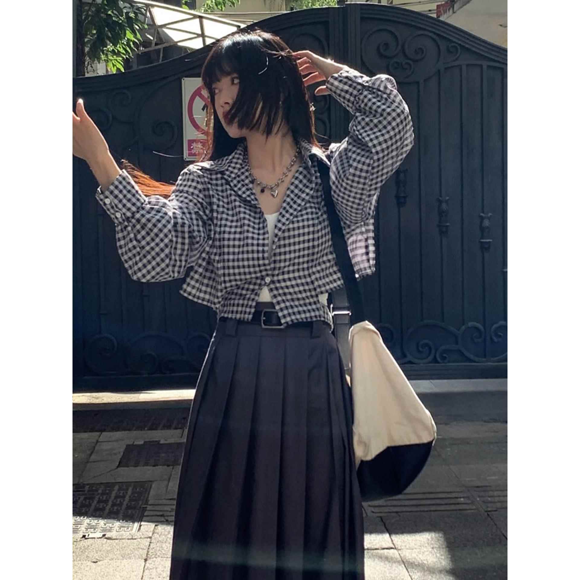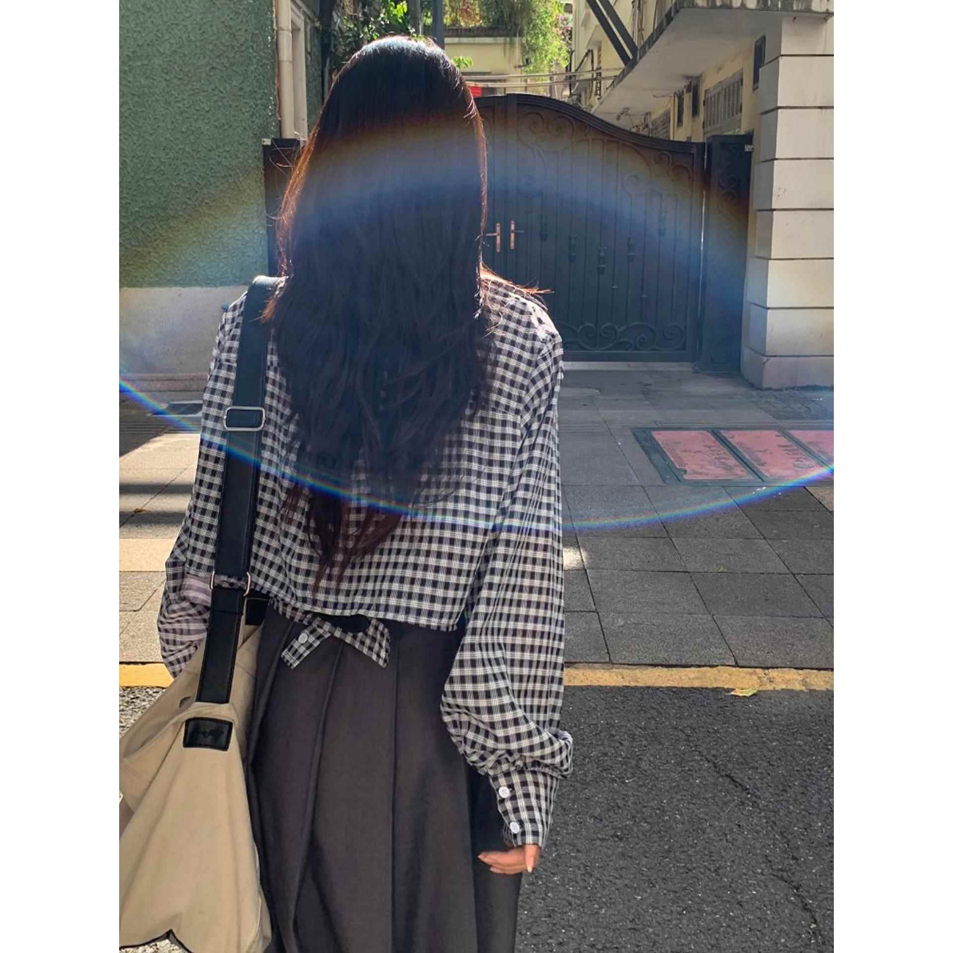 呆毛 覆古短款格子长袖衬衫女早秋设计感衬衣防晒外套小个子上衣