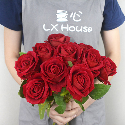 仿真花玫瑰花一支道具客厅餐桌绒布假花绢花花束红色仿真玫瑰假花
