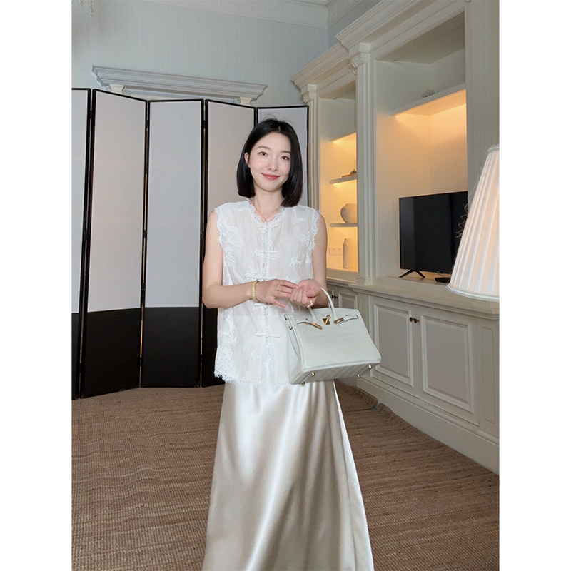 郭九九呢气质新中式显瘦绣花蕾丝上衣夏季百搭斜裁缎面半身裙