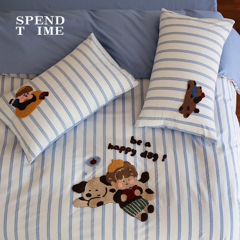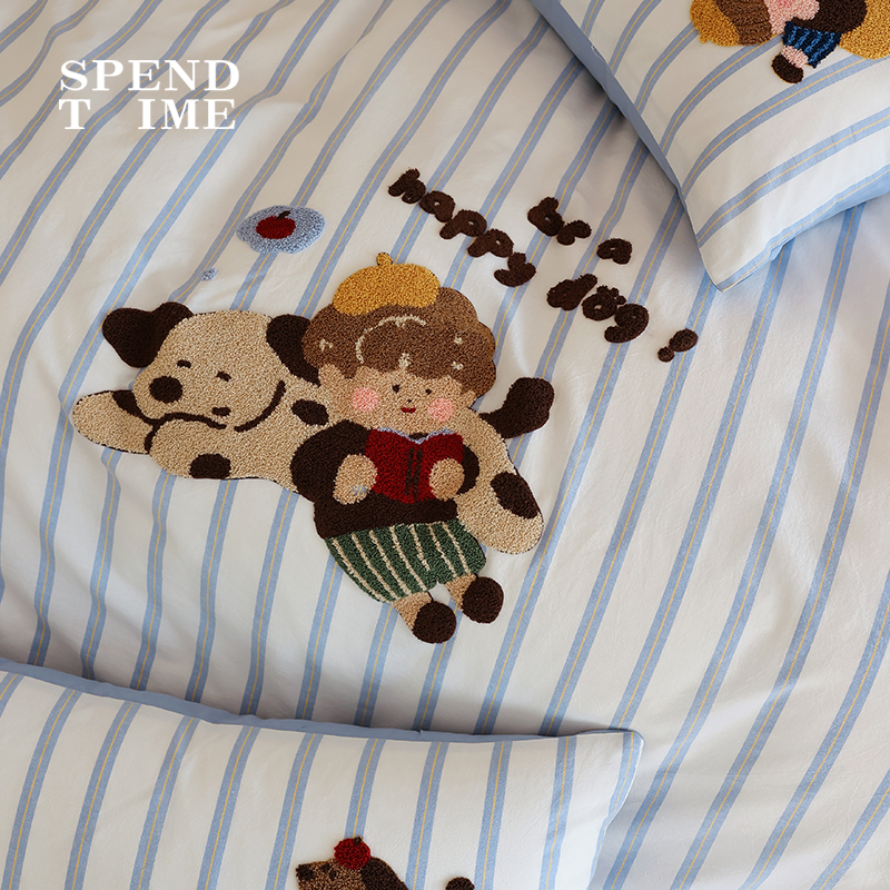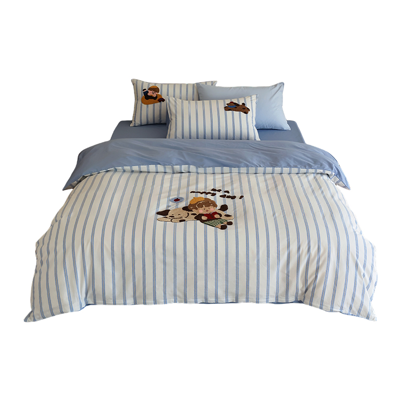 花时间生活儿童卡通毛巾绣床品A类水洗纯棉床单被套条纹四件套