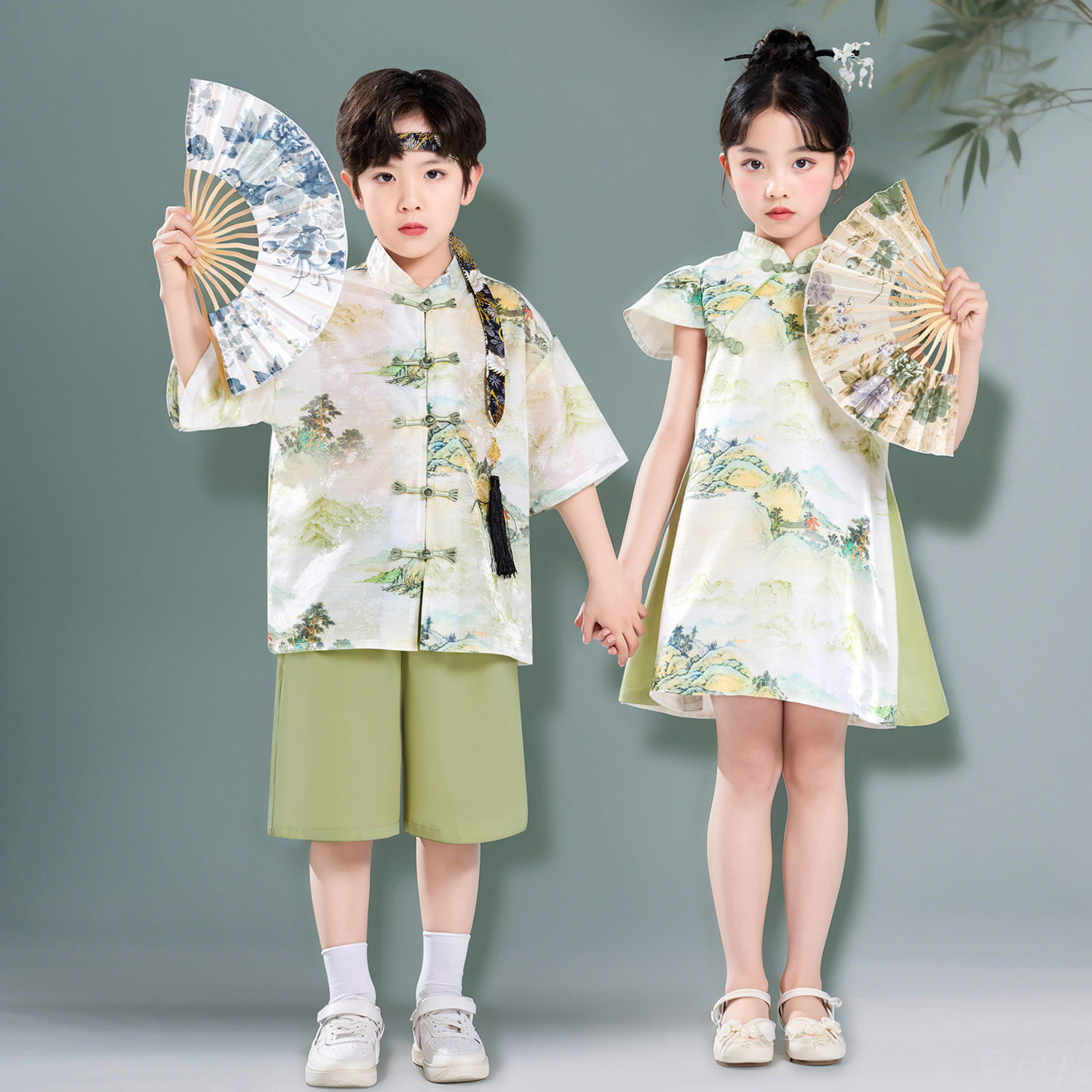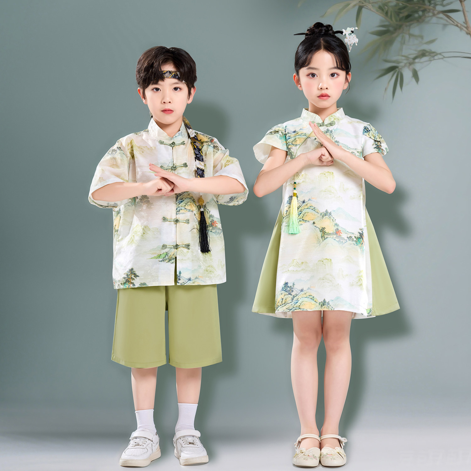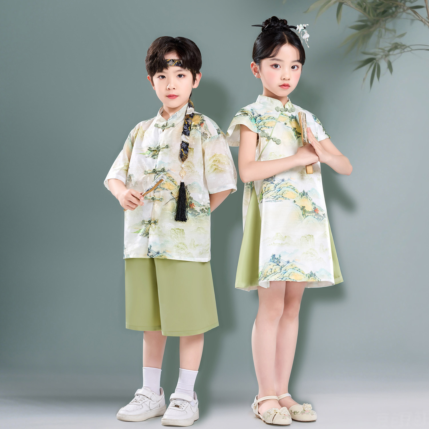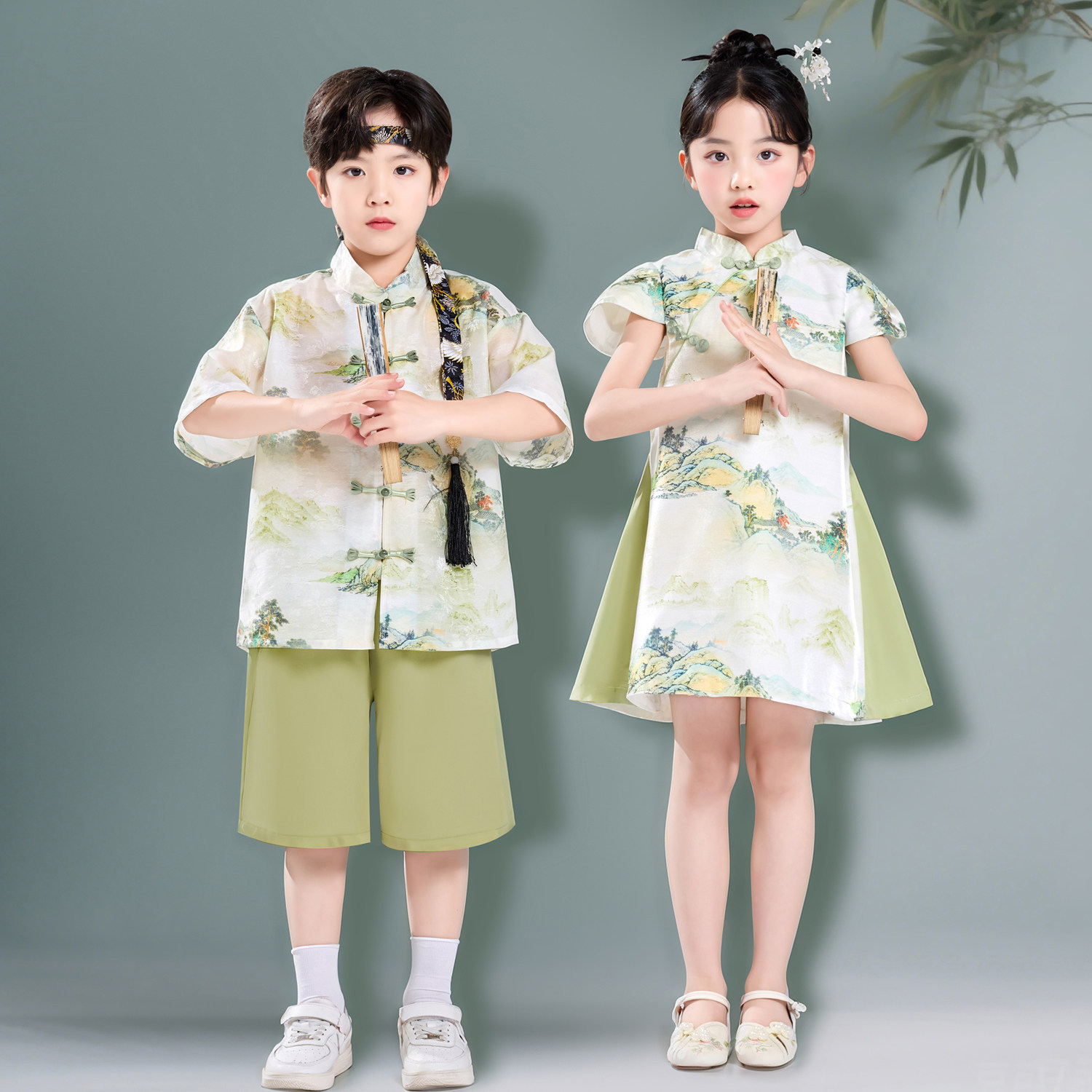 儿童汉服套装夏季女童旗袍六一国风朗诵演出服新款新中式男童唐装