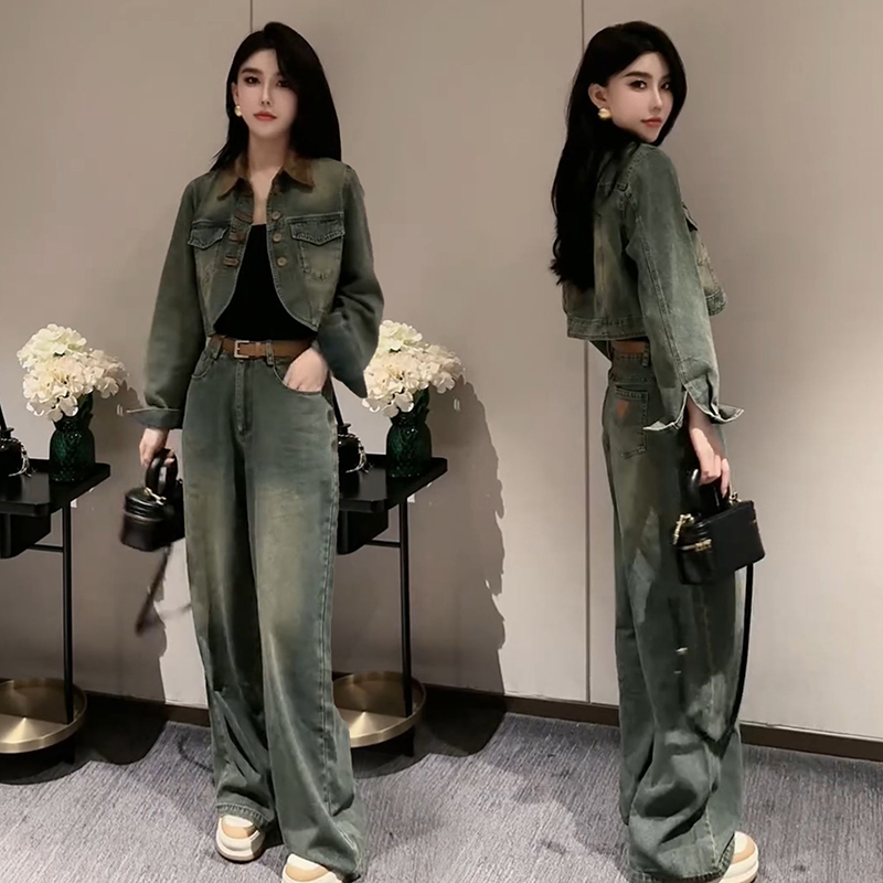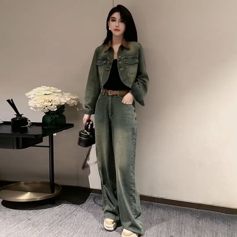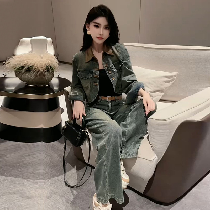 2025春秋季拼接港风复古时尚休闲外套牛仔套装女阔腿直筒裤两件套