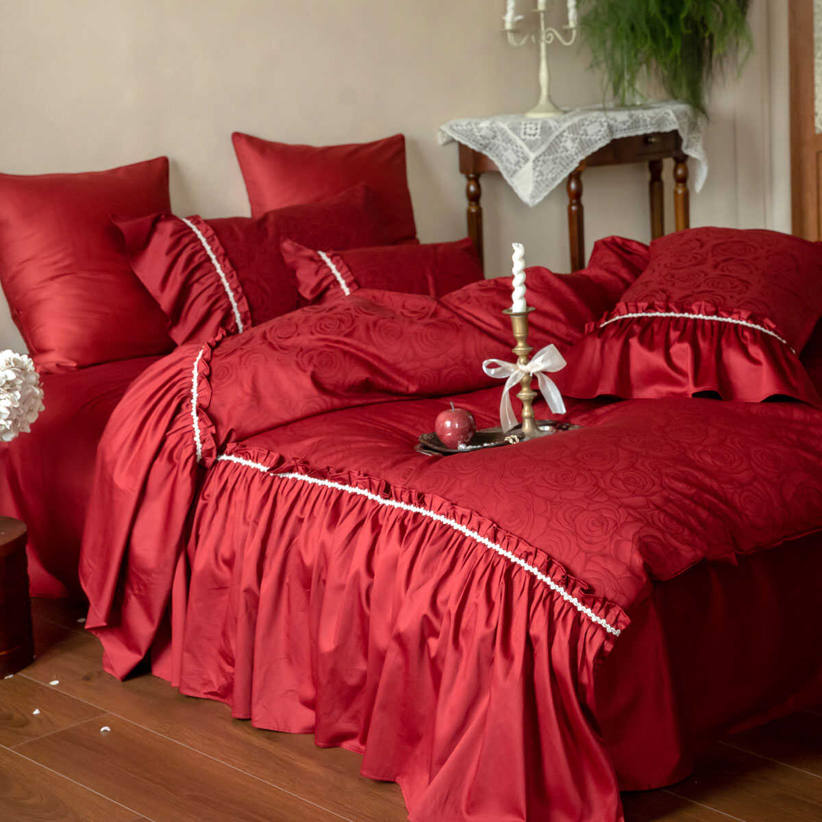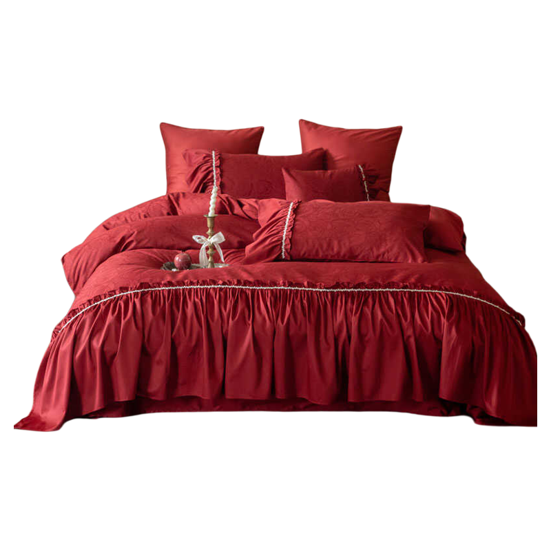 法式荷叶边复古婚庆四件套结婚高级全棉100S红色玫瑰提花被套床单