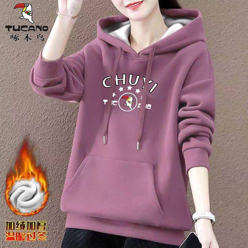 啄木鸟连帽卫衣女秋冬2024新款中年妈妈洋气加绒加厚保暖上衣外套