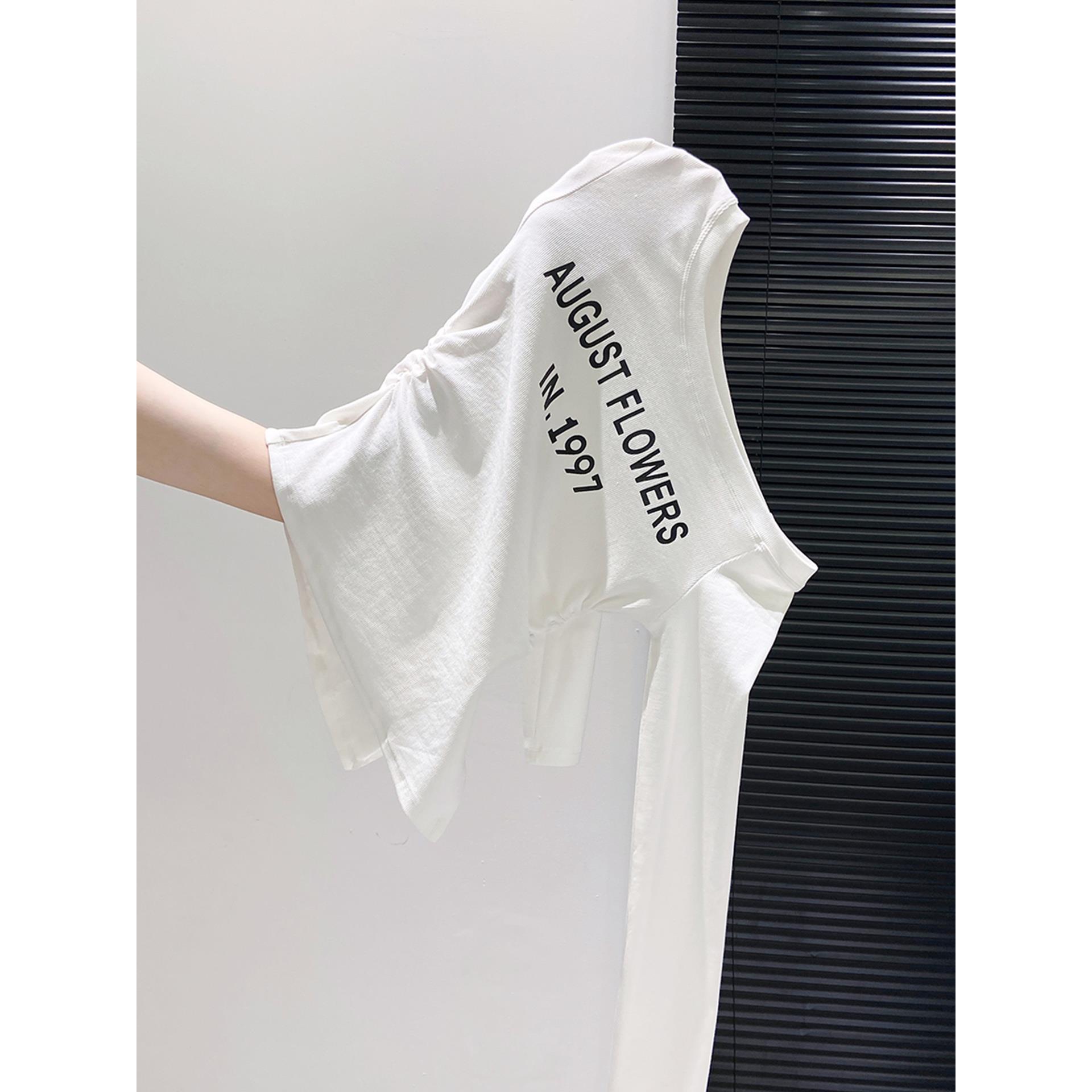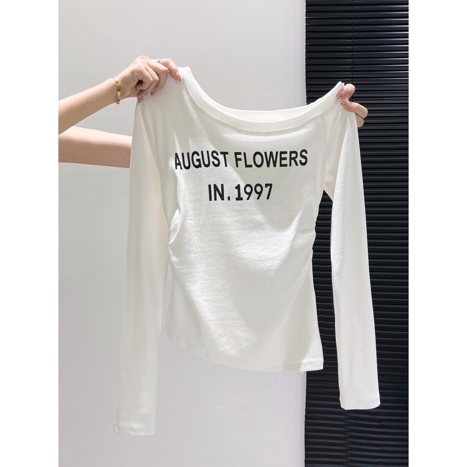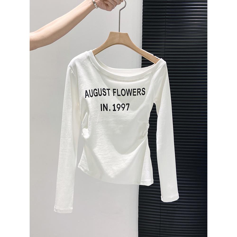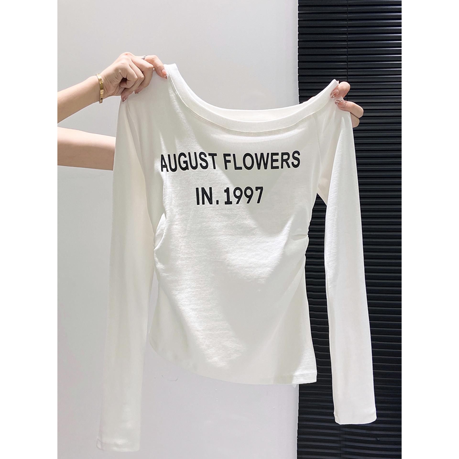 美式印花斜领长袖t恤女早秋季氛围感穿搭收腰开叉打底衫露肩上衣