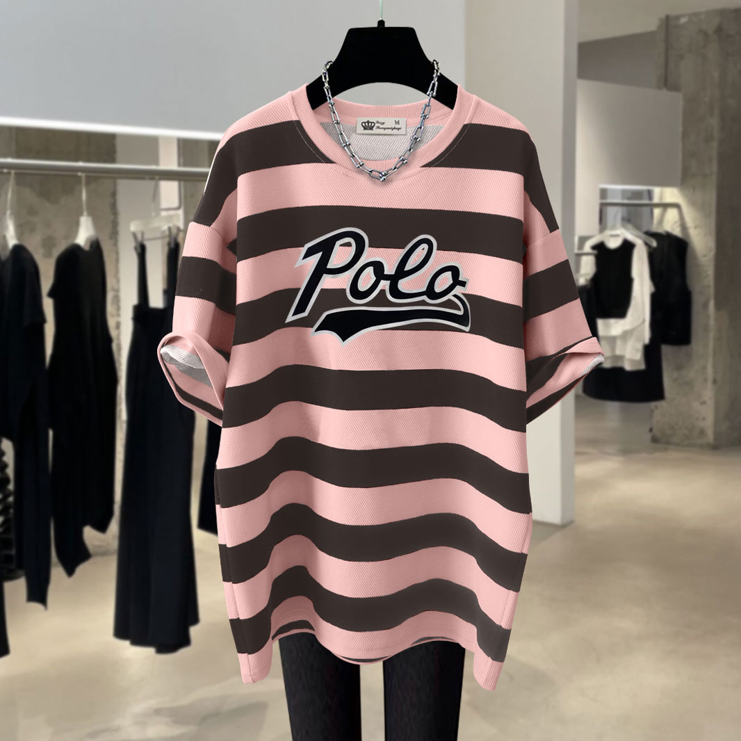 设计感字母条纹圆领短袖T恤女2025春夏大版印花宽松纯棉中长款遮