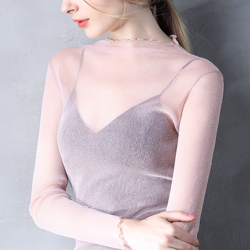 木耳边薄款网纱打底衫女2018春季新款大码上衣女亮丝性感长袖小衫