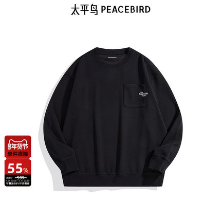 太平鸟男装 秋季黑色胸前口袋卫衣男纯色圆领肌理感套头上衣潮