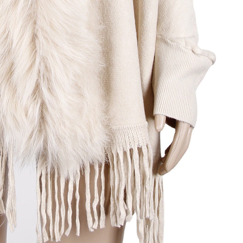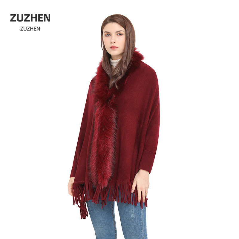 单色毛领针织披肩热卖狐狸毛开衫斗篷披肩涤纶大纯色带袖披肩