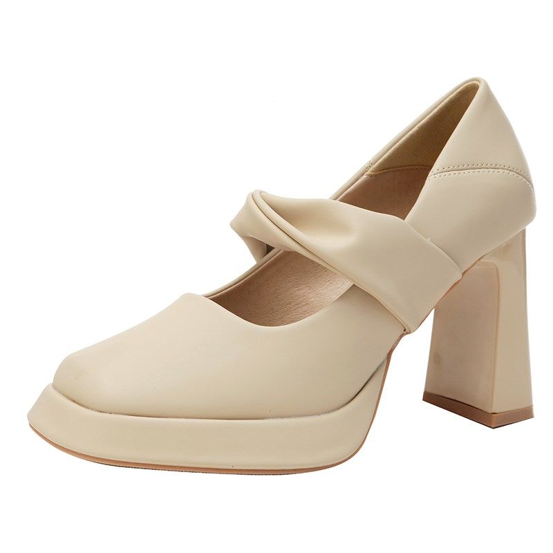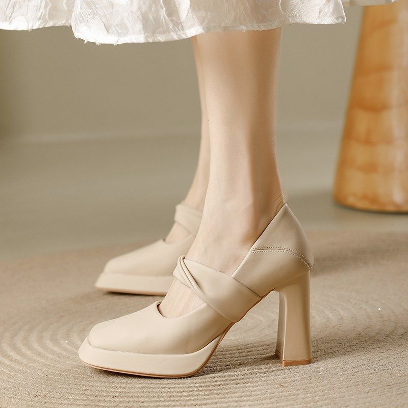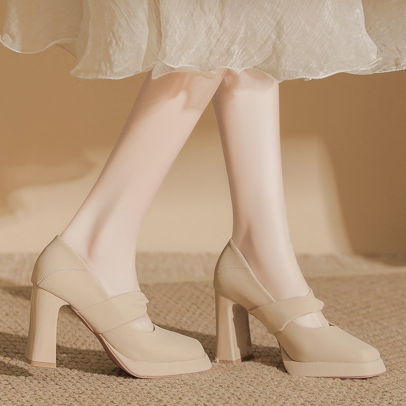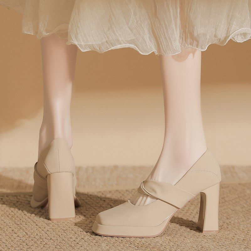 时尚粗跟裸色高跟鞋女春夏2025新款复古方头浅口软皮职业中跟单鞋