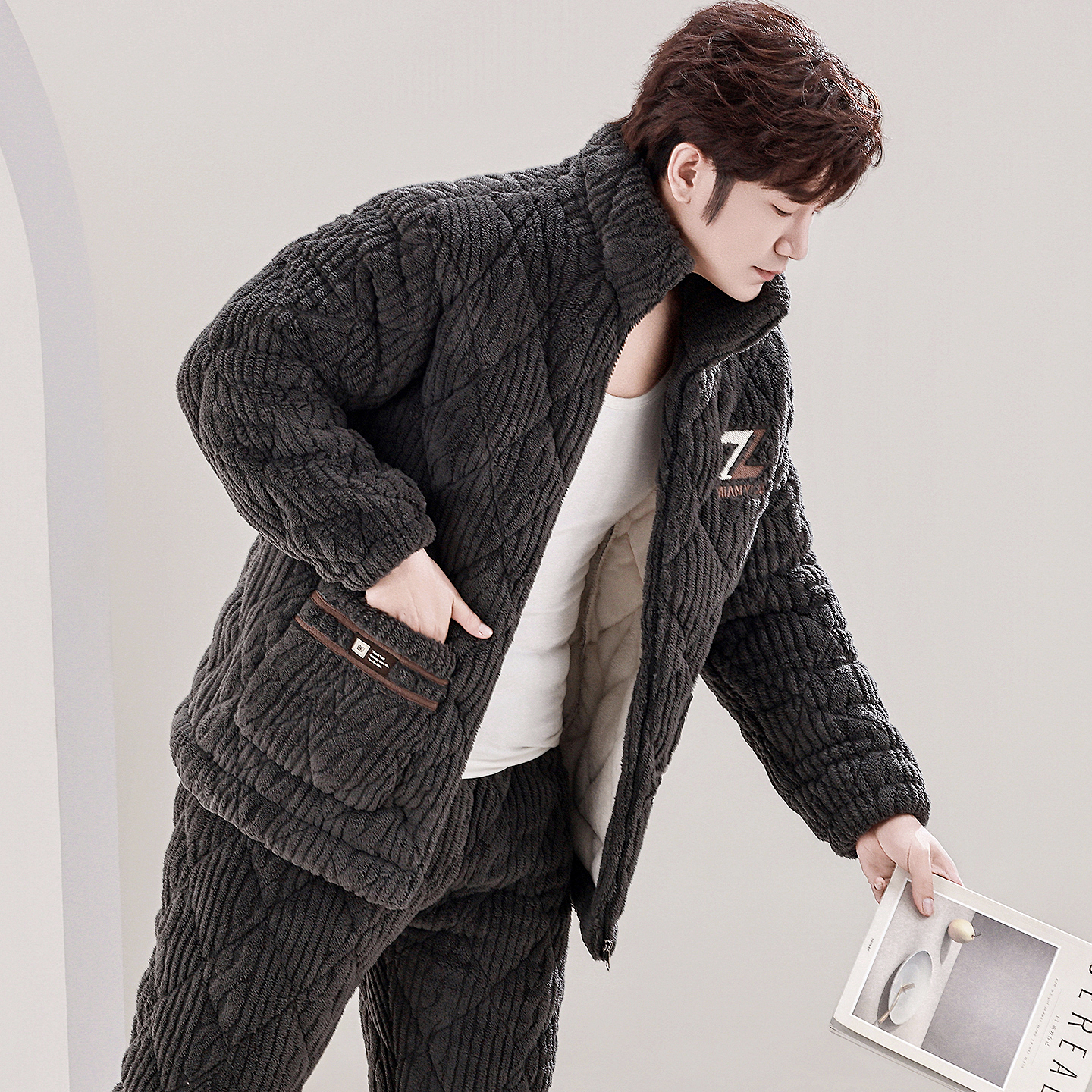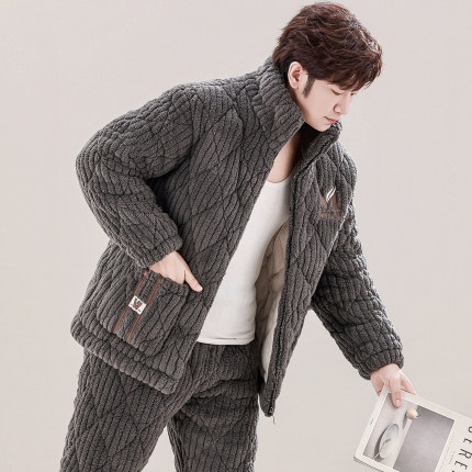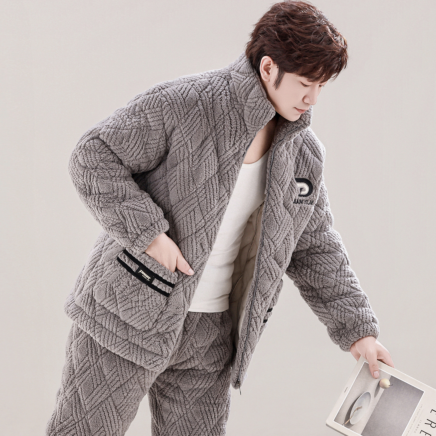 睡衣男士冬季加厚加绒珊瑚绒三层夹棉保暖法兰绒家居服冬天可外穿