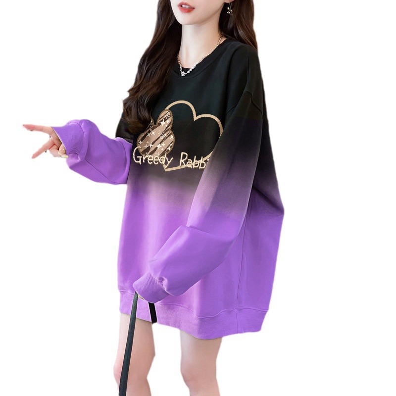 慵懒风洋气印花中长款圆领卫衣女个性重工撞色渐变宽松遮屁股